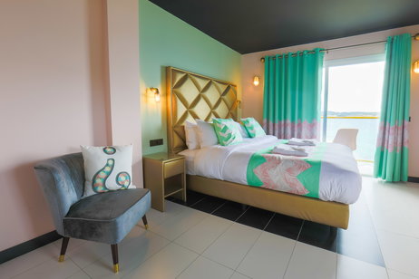 Tea and coffee making is easy, with a Smeg minibar incorporated into the room. The contemporary, open plan bathroom has a rain shower with hairdryer and luxury toiletries from Ibiza.